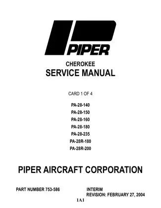 The cover on the 1961-1971 Piper PA-28 Cherokee Series aircraft service manual PDF does more than name the airplane family. It spells out a multi-model Cherokee service manual, shows “Card 1 of 4,” and carries part number 753-586 with an interim revision dated February 27, 2004. For shoppers moving through the broader aircraft manual inventory, those details are the difference between a broad family reference and a narrowly targeted single-model file.