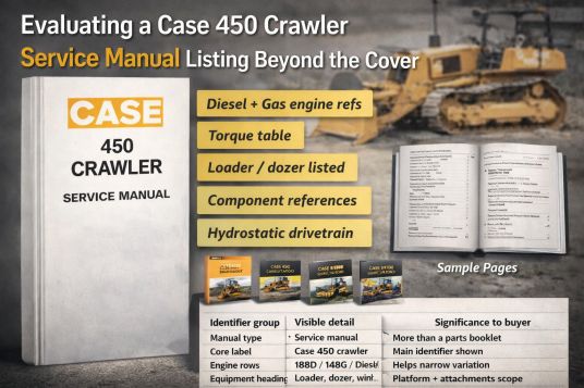 A crawler manual can sound straightforward until the inside pages show how many machine variations are actually folded into the file. The Case 450 crawler service manual PDF is a good example of a listing that becomes much clearer once you look at the contents and specification pages rather than stopping at the model name alone. For buyers comparing documents in the broader crawler equipment manual catalog, this is the kind of file that helps separate a base machine title from a much wider service-reference package.