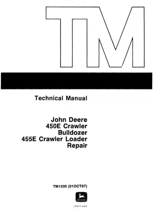 The strongest clue is right on the title page. The uploaded file identifies a John Deere 450E Crawler Bulldozer / 455E Crawler Loader Technical Manual with publication code TM1330 and an 01 OCT 87 marking.